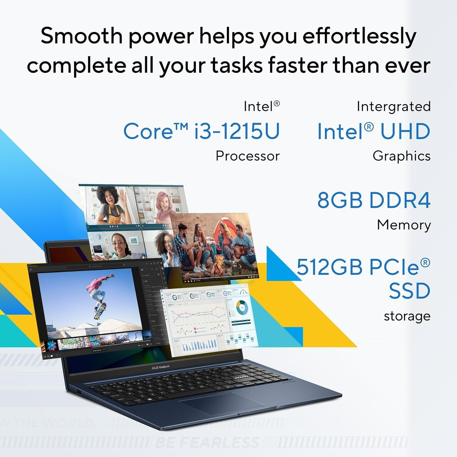 The ASUS Vivobook 15, powered by the Intel Core i3-1220P 12th Gen processor, delivers a commendable performance. The 15.6″ FHD display provides crisp visuals, and the slim design adds to its portability. With 8GB RAM and a spacious 512GB SSD, it offers smooth multitasking and ample storage.The integrated graphics are suitable for everyday tasks, though it may not handle demanding graphics-intensive applications. The inclusion of Windows 11 and Office 2021 enhances productivity, and the Alexa built-in feature is a convenient addition for voice commands.The fingerprint sensor adds a layer of security, and the lightweight design at 1.7 kg makes it easy to carry. The blue color adds a touch of style to the laptop. Overall, the ASUS Vivobook 15 is a well-rounded option for users seeking a reliable, mid-range laptop for daily use.