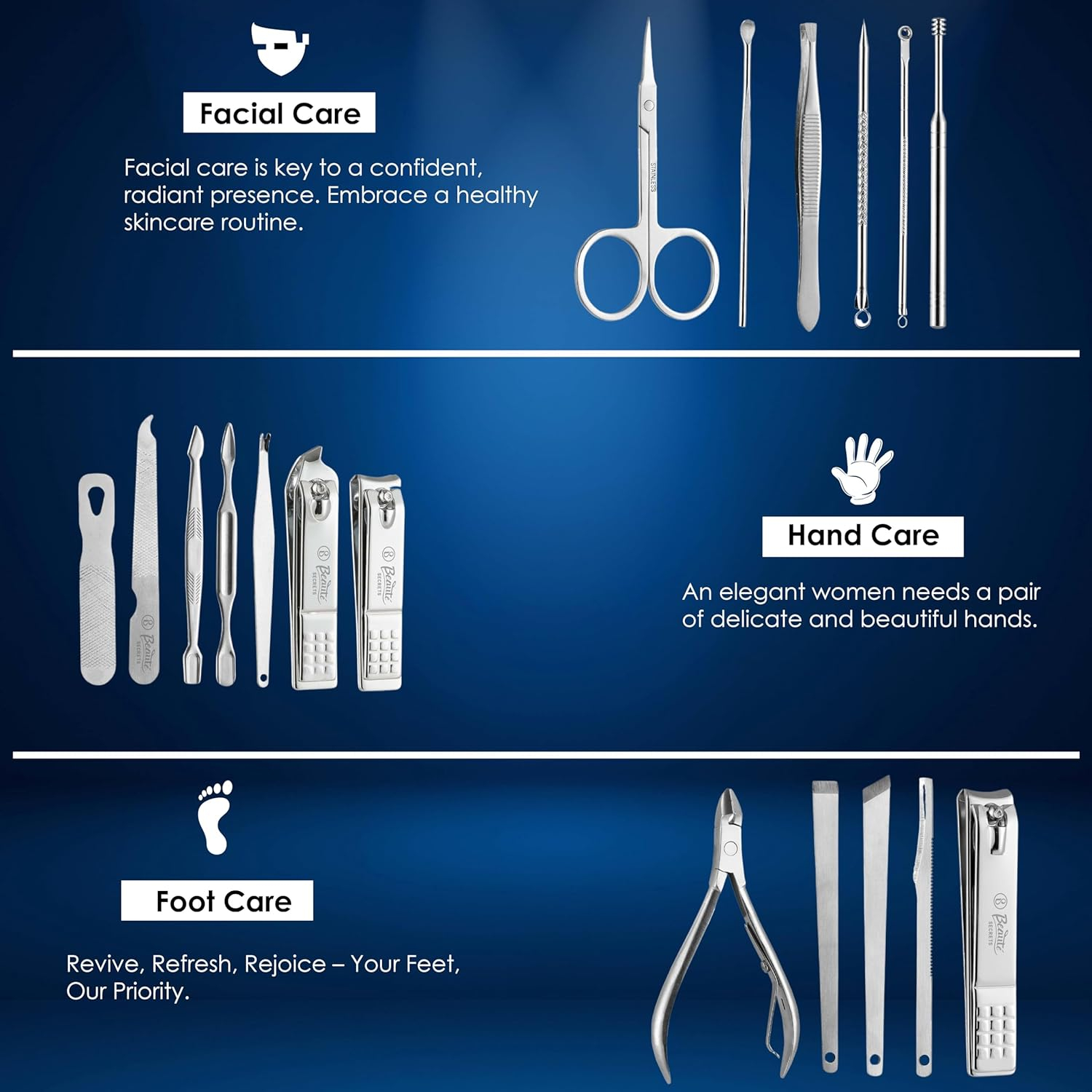 • Foot care:1 x Toe-Nail Clipper, 1 x Cuticle Nipper, 1 x Toe-Nail File, 1 x Peeling Knife, 1 x Cuticle Knife,1 x Straight Pedicure Knife, 1 x Diagonal Pedicure Knife, 1 x Single-edged Double-sided Push Stick, Hand care : 1 x Nail Clipper, 1 x Nail File, 1 x Diagonal Nail Clipper,1 x V-Shaped Cuticle Trimmer, 1 x Single-edged Double-sided Push Stick.